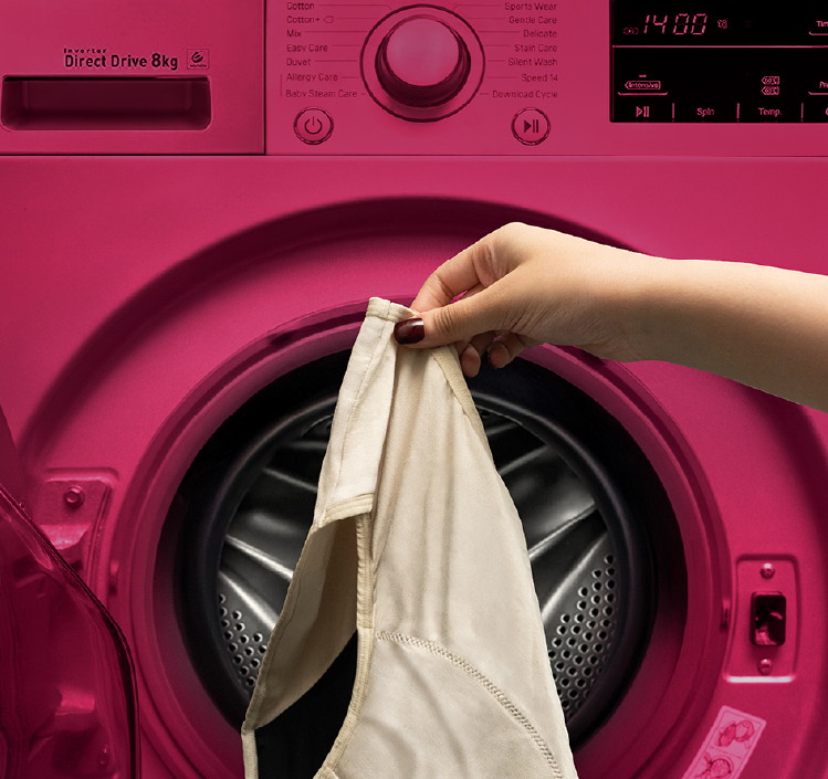 All it takes is an initial personal rinse, followed by regular detergent wash in the machine or by hand. Hang dry and re-use! Watch the video here.